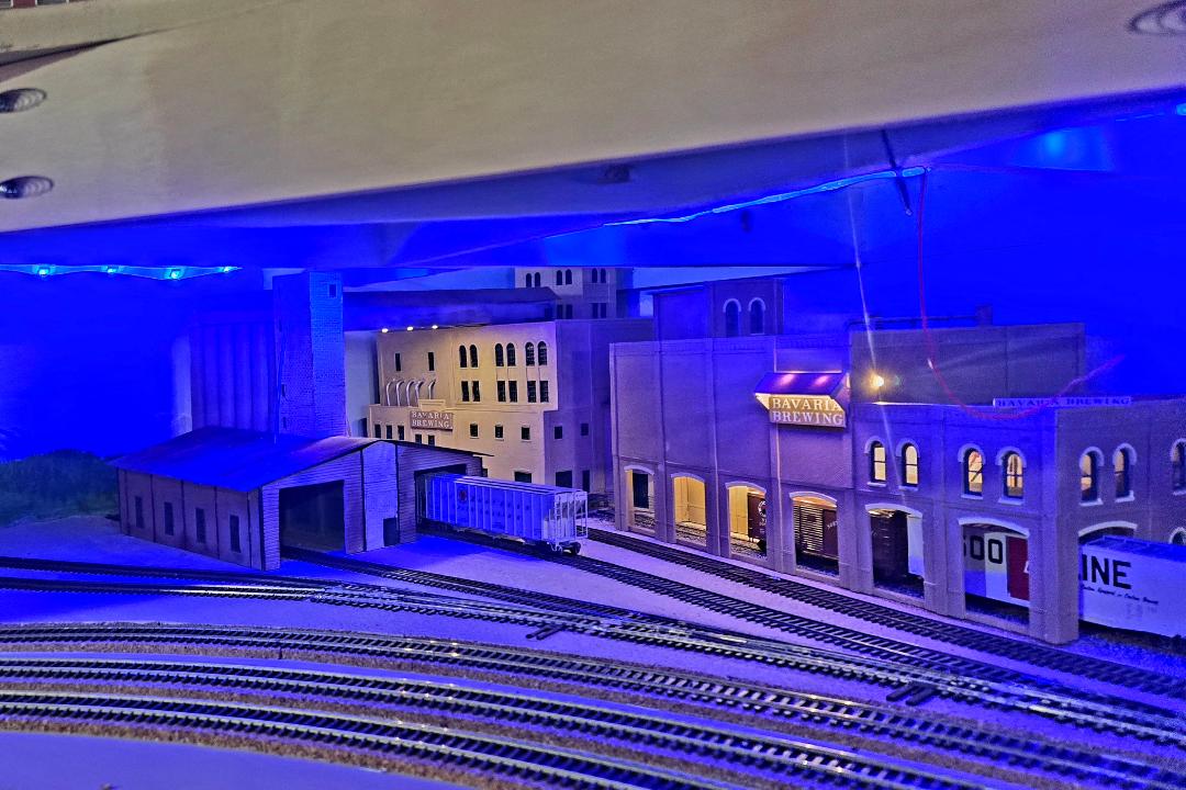Only a small amount of scenery is built so far and a few structures, including a brewery complex in one town, are in place. Most of the level 2 and level 3 benchwork around the perimeter of the basement is in place. in the summer of 2025, work crews have helped build the raised floor and part of the mushroom-design benchwork in the middle of the main room, as well as some and lower level benchwork in other areas. Roll-out drawers have also been built to house much of the under-the-layout electronic components to help ease future construction and maintenance. Currently a paper mill area is being planned and built on level one.
